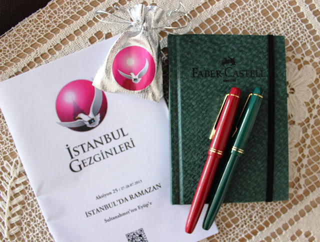 I attended a Ramadan tour which a friend of mine organized. It started with breaking of the fast in Sultanahmet and ended until dawn where people start fasting. I carried my Faber-Castell notebook and my Pilot 78G fountain pens. And the small sac was a gift reminding old Ottoman customs. People used to give gifts to people to thank who attended the fast breaking meals. And my friend prepared those little sacs to thank us. Isn't it nice?