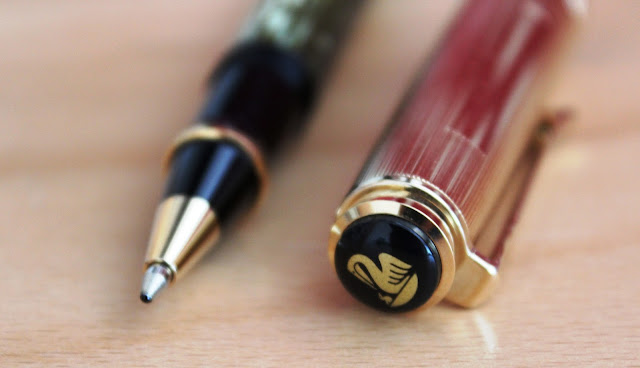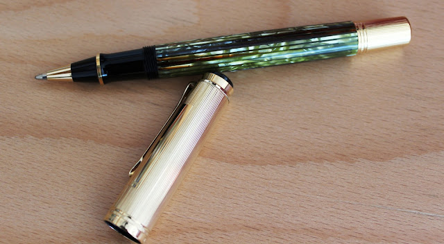 Kalem gördüğünüz gibi oldukça şık. M450 isimli dolmakalemin, roller versiyonu. Burada ufak bir parantez açalım; M450, M400'ün aynısı olmakla birlikte kapağı ve piston topuzu altın kaplama versiyonu. Bu da M450'nin rollerball olanı. Daha önce rollerball ve tükenmez kalem arasındaki farkı açıkladığım yazı için, buraya tıklayabilirsiniz.