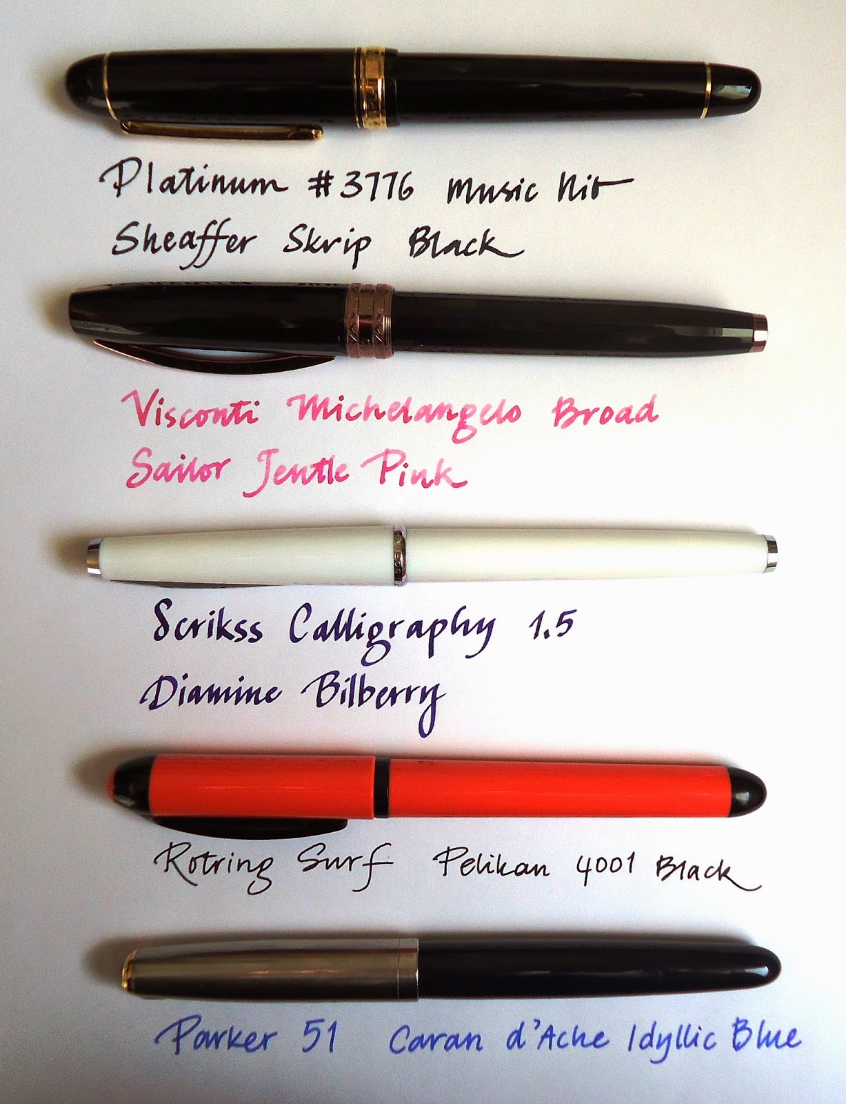 I would like to make a Currently Inked post in mid week today and if you don't mind I want to use it as a bit chit-chat. Here is 5 currently inked pens of mine. First; there is Platinum 3776 Music Nib. I was setting my eye on this pen for a loooong time and in previous months I finally had my guts to get it. It has Sheaffer's Skrip Black ink, it can be the wettest black ink I have ever used. Second pen is my own present to myself for the 2. anniversary of my blog; Visconti Michelangelo. I am in love with this pen with its 23K palladium nib. (I am just wondering what if I change the nib with a medium) I wanted to break the masculine look of pen, so I inked it with Sailor Jentle Pink. Third pen is 1.5 italic from Scrikss Calligraphy set. It has Diamine Bilberry in it. It is a great highly saturated color from blue up to purple with great golden sheen. Fourth pen is a Rotring Surf, a great pen although its fine nib. And finally legendary Parker 51 with Caran d'Ache's new blue; Idyllic Blue.