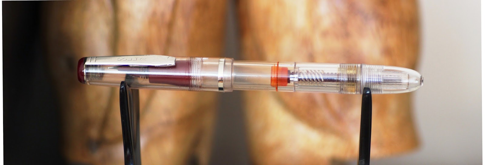 This model, referred as 717i Demonstrator is transparent other than the top jewel, grip section, feed and piston screw. This allows us to see through the ink and it is an eye candy. The body material is not perfect. Even though it is not cracked yet, it gives the impression it might be in the future.
