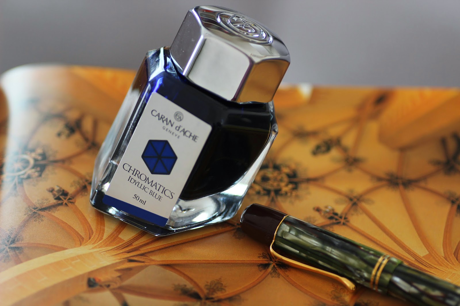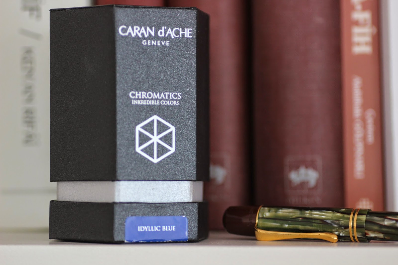 Bildiğiniz gibi high-end ya da lüks segment diyebileceğimiz mürekkep pazarında coşkulu bir hareketlenme var. Pilot Iroshizuku ve Pelikan Edelstein'in ardından Caran d'Ache ve Graf von Faber Castell de yeni mürekkep serileri piyasaya sundular. Bu serilerin ortak özellikleri, çok güzel şişelerde piyasaya sunulmuş olmaları desek yanlış olmaz. Ben de Caran d'Ache'ın Earth serisi mürekkeplerini çok seven biri olarak, yeni mürekkeplerine kayıtsız kalamadım ve Idyllic Blue rengini denemek istedim. Mürekkebimiz, altıgen, sert kartondan yapılmış şık bir kutuda geliyor. Kutunun üzerinde rengi ve mürekkebin adını gösteren bir sticker mevcut.