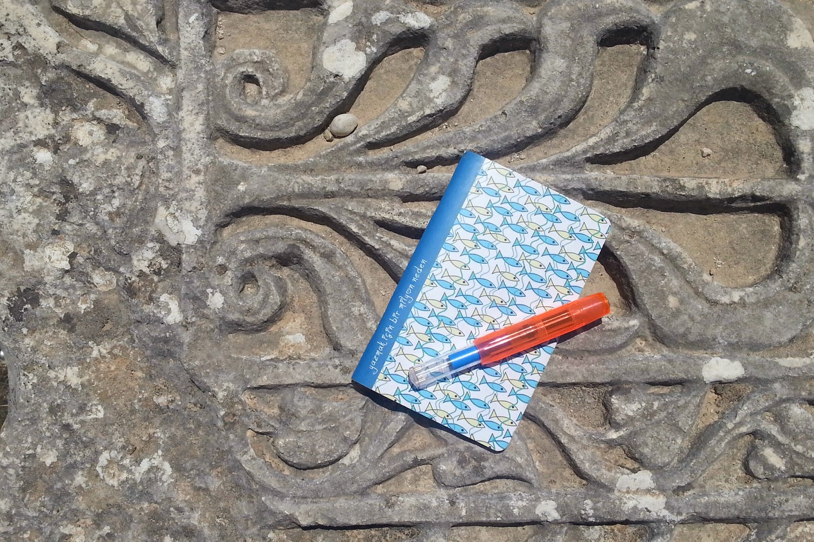 Bu haftanın pazar postası bol fotoğraflı çünkü araya biraz zaman, biraz tatil, biraz da tadilat girdi. Üstteki fotoğraf tatilden; yanımda ufak bir defter ve yazın ruhuna uygun Kaweco Ice Sport kalemimi götürdüm.