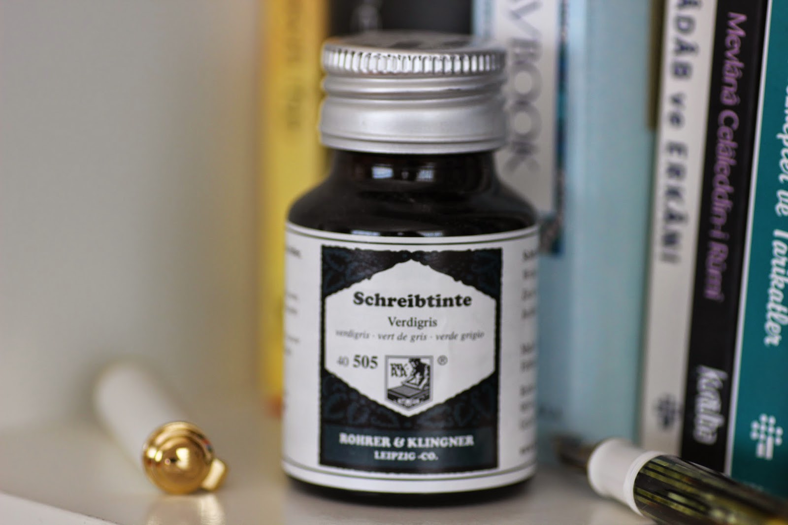 R&K Verdigris comes in broad neck, dark glass bottle with a metal cap which looks like old pharmaceutical bottles. Broad neck is an advantage for big pens such as Pelikan M800, M1000 etc. And dark colored glass protects the ingredients exposing from the sunlight.