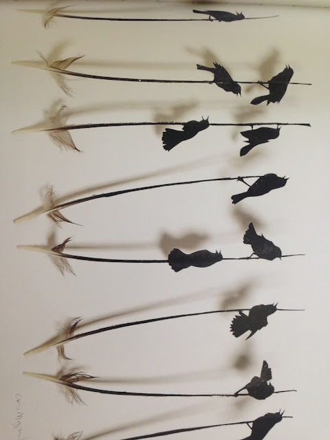 Andreas Schlavo is composing his art with the color crayons and pens and Chris Maynard is an artist cutting out shapes, especially birds from the bird feathers.