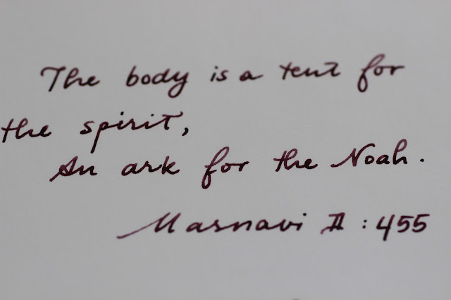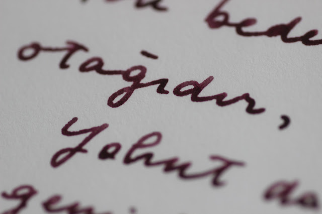 Biraz zor kurusa ve su ile dağılma emareleri gösterse de, Noodler's Black Swan in Australian Roses benim çok severek kullandığım bir mürekkep. Ayrıca bu mürekkebin yüzey gerilimi nedeniyle esnek uçlu kalemlerle çok iyi anlaştığı, daha az "railroading" yaptığı da bir gerçek.
