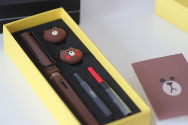 Lamy'nin her sene yeni bir renk limited edition kalem çıkardığını biliyoruz. Bunun yanısıra, bazı ülkelere özel kalemleri de olabiliyor. Örneğin beyaz Safari gövdesi üzerine kırmızı klipsli Japonya özel üretimi, sarı Safari gövdesi üzerine kırmızı klipsli İsveç özel üretimi gibi... Lamy Line Friends de Kore için yapılmış özel üretim Lamy'lerden bir tanesi. Sarı bir kutu içerisinde, bir kartuş, bir dönüştürücü ve iki adet klips aksesuarı ayıcıkla birlikte geliyor.