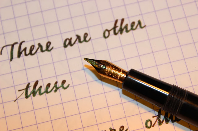 It is a very old photograph, probably two years before. The sheen created by the ink which waited for years in a pen that I got from a thrift store. It is just the green sheen we are looking for now by the famous Emerald of Chivor.