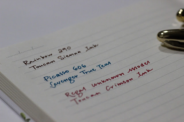 My notebook is lined. And it has a place to note the date in every page. I tried this notebook with a Rainbow 290 with Toucan Sienna ink, Picasso 606 candle flame with Levenger True Teal and lastly a Regal Fountain Pen with Toucan Crimson.