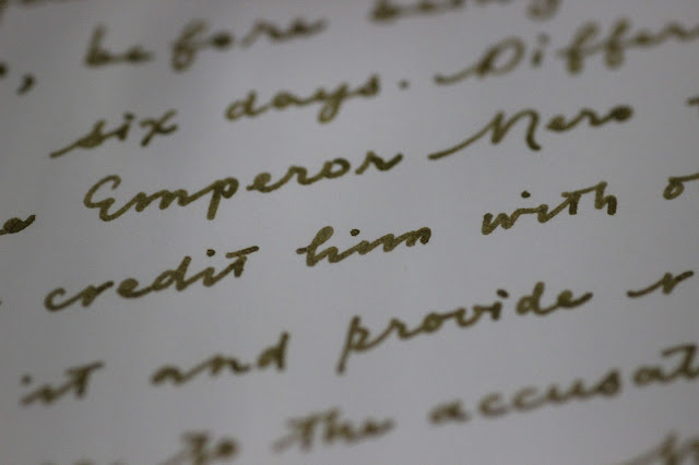 Let's start new year with a great ink. Noodler's Rome Burning! I guess I get this ink in 2012 which contains yellow-brown and green together and hard to describe as a color. I know I am too late to write.
