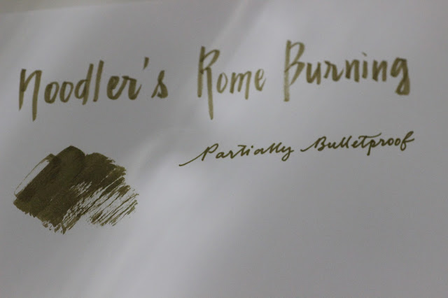 Güzel bir mürekkeple başlayalım yeni yıla. Noodler's Rome Burning! Rengi sarı-kahverengi ve yeşili birlikte barındıran ve tarifi zor bir renk olan bu mürekkebi sanırım 2012 yılında edinmiştim. Yazmak bu zamana kısmetmiş.