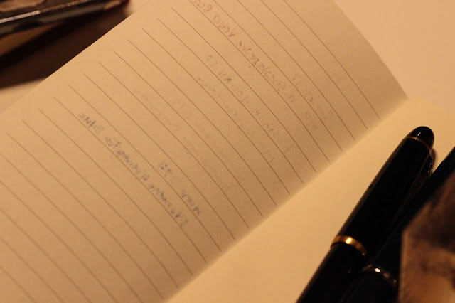Defteri beş ayrı kalemle denedim. Kuru sayılabilecek bir Scrikss 17'nin için Montblanc W. Sheakspeare Velvet Red mürekkep var. EF uçlu Pelikan 400 NN'imde ise Montblanc Oyster Grey, oldukça ıslak yazan Soennecken s19'umda kuru bir mürekkep sayılabilecek Montegrappa Burgundy ve Hero 395'de Diamine Kensington Blue var.