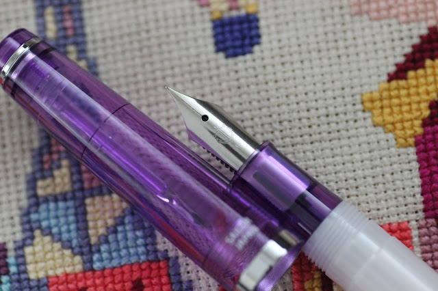 My Sailor Lecoule has a pearl white body and semi-transparent purple cap on body top. There is no big branding on the pen. It just says Lecoule on one side of the cap end and Sailor Japan on the other end. Cap is a screw type so you don't have to worry about any loosening kind of problems. Only thing you can worry is some friend you start pulling your screw cap pens as they lay their hands on.