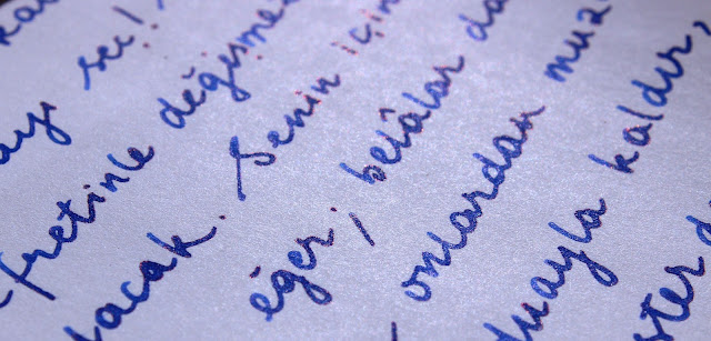 Visconti'nin mavi mürekkebinin güneşle oynaşan revnaklarını çektim hayranlıkla. (Bu arada, mükemmel mavi mürekkebin peşinde koşuyorum bir süredir. Aynı kalemi kullanarak, aynı deftere elimdeki tüm mavi mürekkeplerle yazıyorum. Tamamlanınca sonuçları sizinle de paylaşacağım. Bakalım siz en çok hangi maviyi beğeneceksiniz)